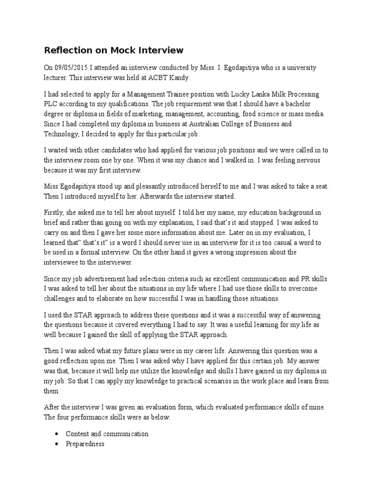 Be brief but make sure you have addressed any concerns the interviewer has. It was a very valuable experience for me for many reasons. Reflecting on your interview performance and lessons learned 23. Interview questions can run the gamut. Preparation for the interview includes reviewing the open position's requirements and writing an outline of skills, personality traits, experience and educational requirements you seek in the candidate for the position. Know that the other candidates have been treated the same way and that it is not a reflection of. This interview training a step by step job interview simulation and interview exercises, a mock up. In this interview, i gave the interviewer a hard copy of my cv and letter of application; Look for sample interview tests online and practice doing them such as psychometric, personality and aptitude tests. Try video recording yourself during a practice interview to observe your body language. Interviewing candidates for job positions is an essential part of operating a business. Any work experience or skills you have listed on your resume are fair game to talk about during the interview. Throughout the interviews i took parallel notes, recording my own experience, practice and reflection on the process.